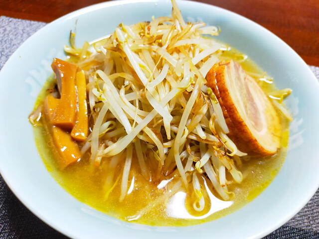 もやしを炒めて、あと叉焼とメンマのセットも温めてから乗せました。